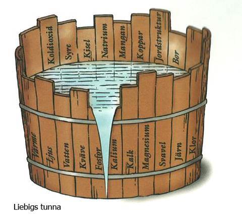 Det räcker med att det är brist på ett näringsämne för att inte nå upp till full skörd vilket här illustreras av "Liebigs tunna".