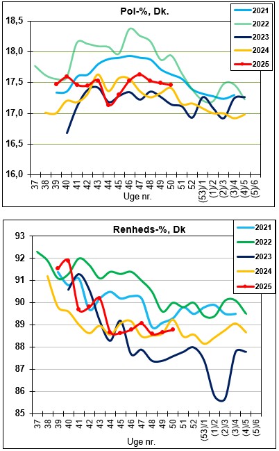 I nedenstående kurver vises pol-% og renheds-% for de sidste fem år.