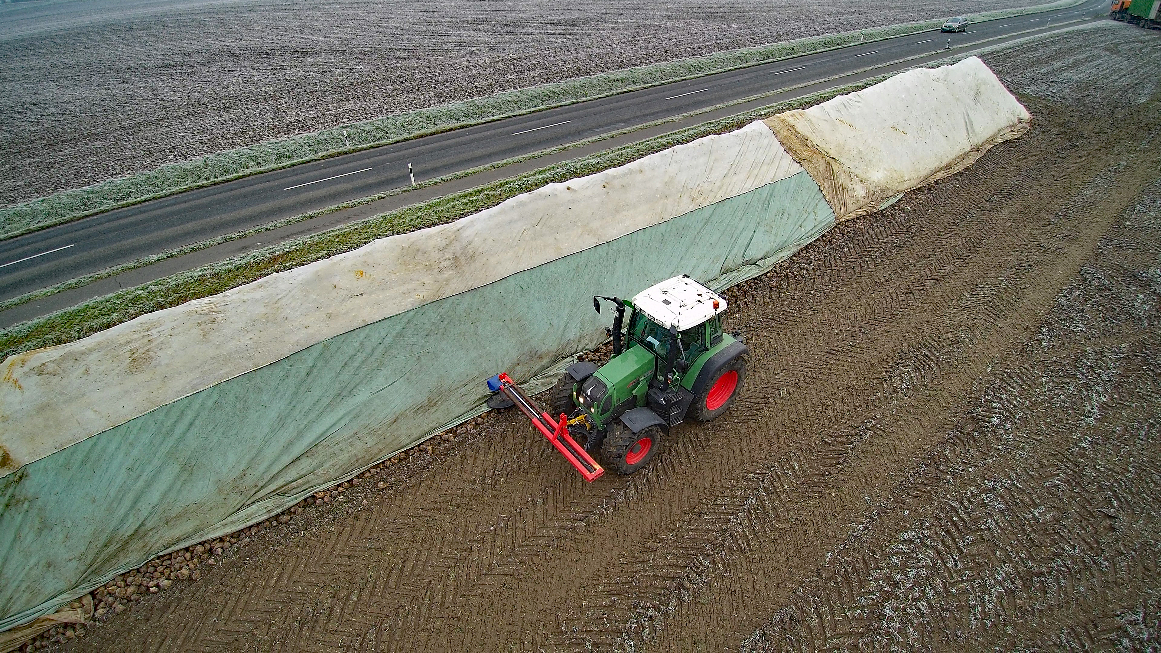 Dugene er på nuværende tidspunkt frosne og kan ikke rulles op. Derfor er kuledækkerne nødt til at trække dem af, og lade dem ligge i markerne. De kommer og henter dem, så snart det bliver tøvejr, og når de har tid, kommer de rundt og ruller dem op.