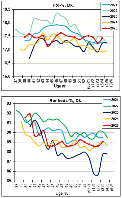 I nedenstående kurver vises pol-% og renheds-% for de sidste fem år.