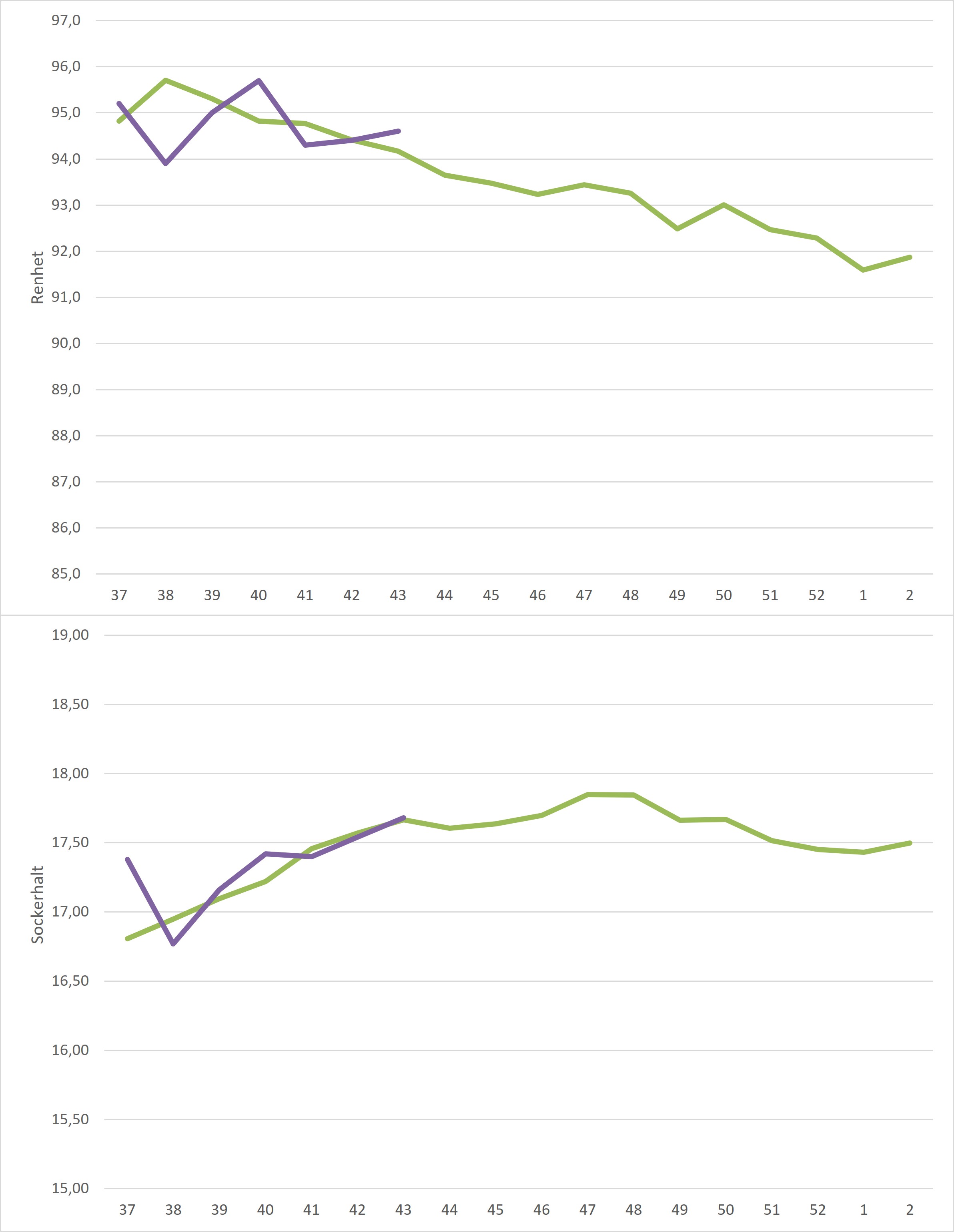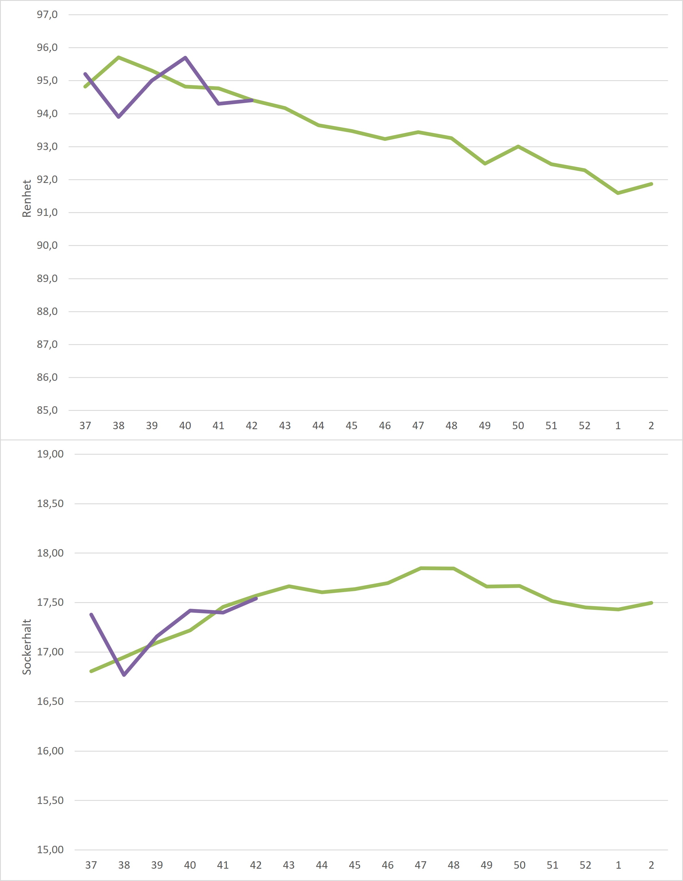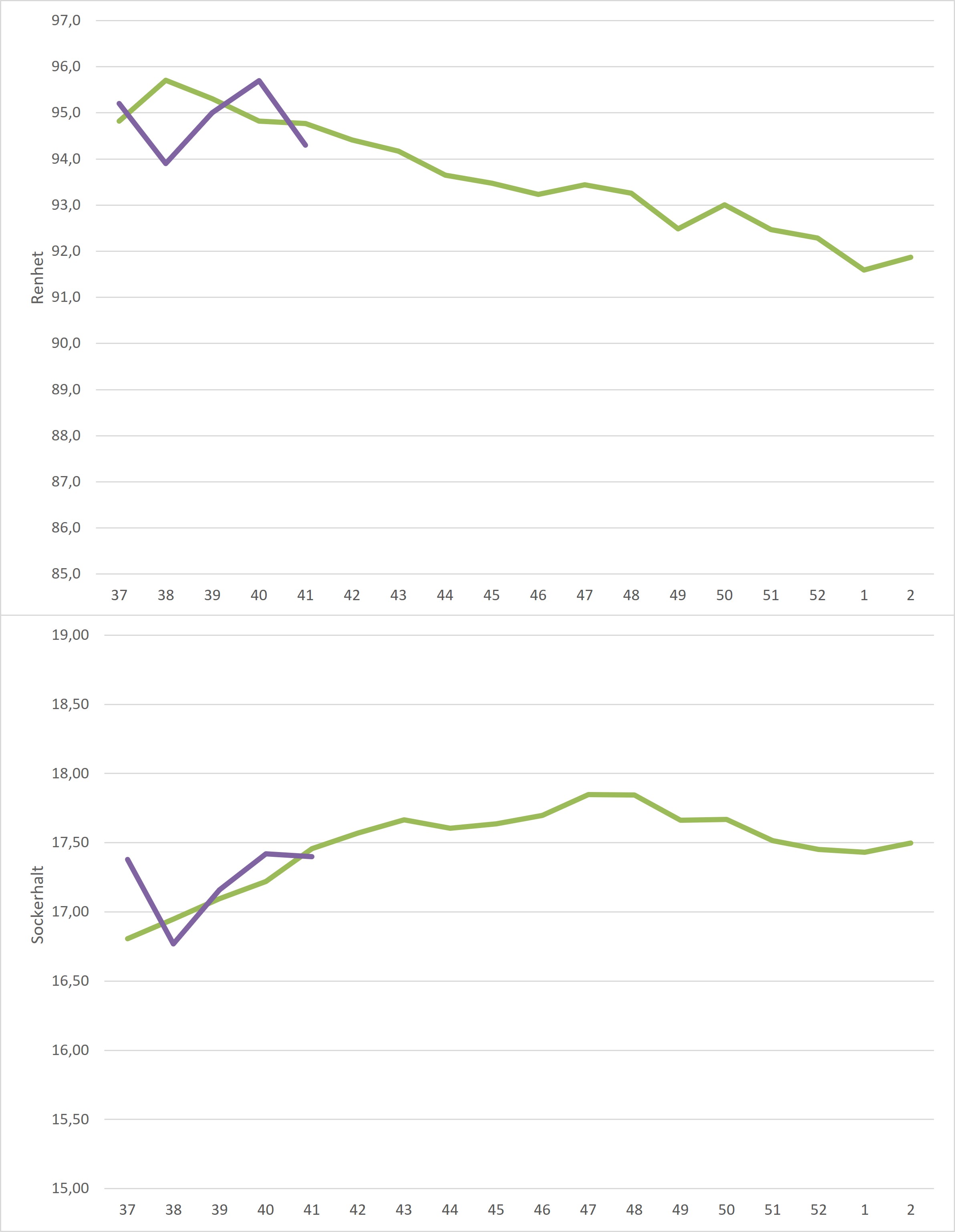 Kampanjdata vecka 41 /irj/portal/nordzucker/sv?NavigationTarget=navurl://91666964a1372051f97eb270d017de34&paraconfig=OT-DS-Server_agriportal&paraurl=http%3A%2F%2Fgut210146.nordzucker.lan%3A8080/cps/rde/xchg/agriportal/hs.xsl/22360.htm2025-10-1500:00:0022360.htmNederbörd har det kommit och hur det har påverkat medelrenheten för veckan syns i diagrammet här nedan. Renheten sjönk från förra veckans 95,7% till 94,3% och hamnade under femårsmedel. Även sockerhalten sjönk, dock inte så mycket som renheten. Från förra veckans 17,42% landade denna veckans medel på 17,40%.