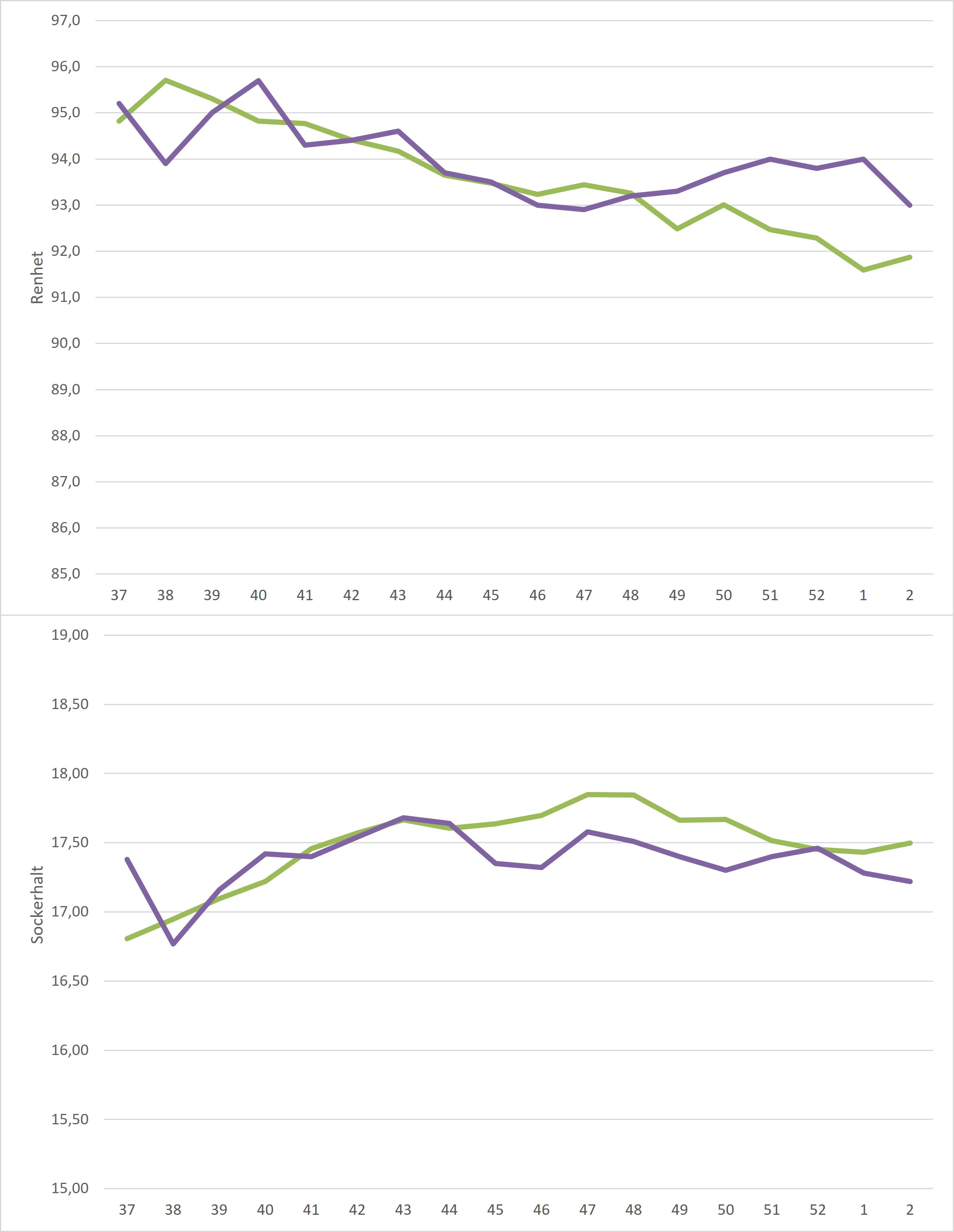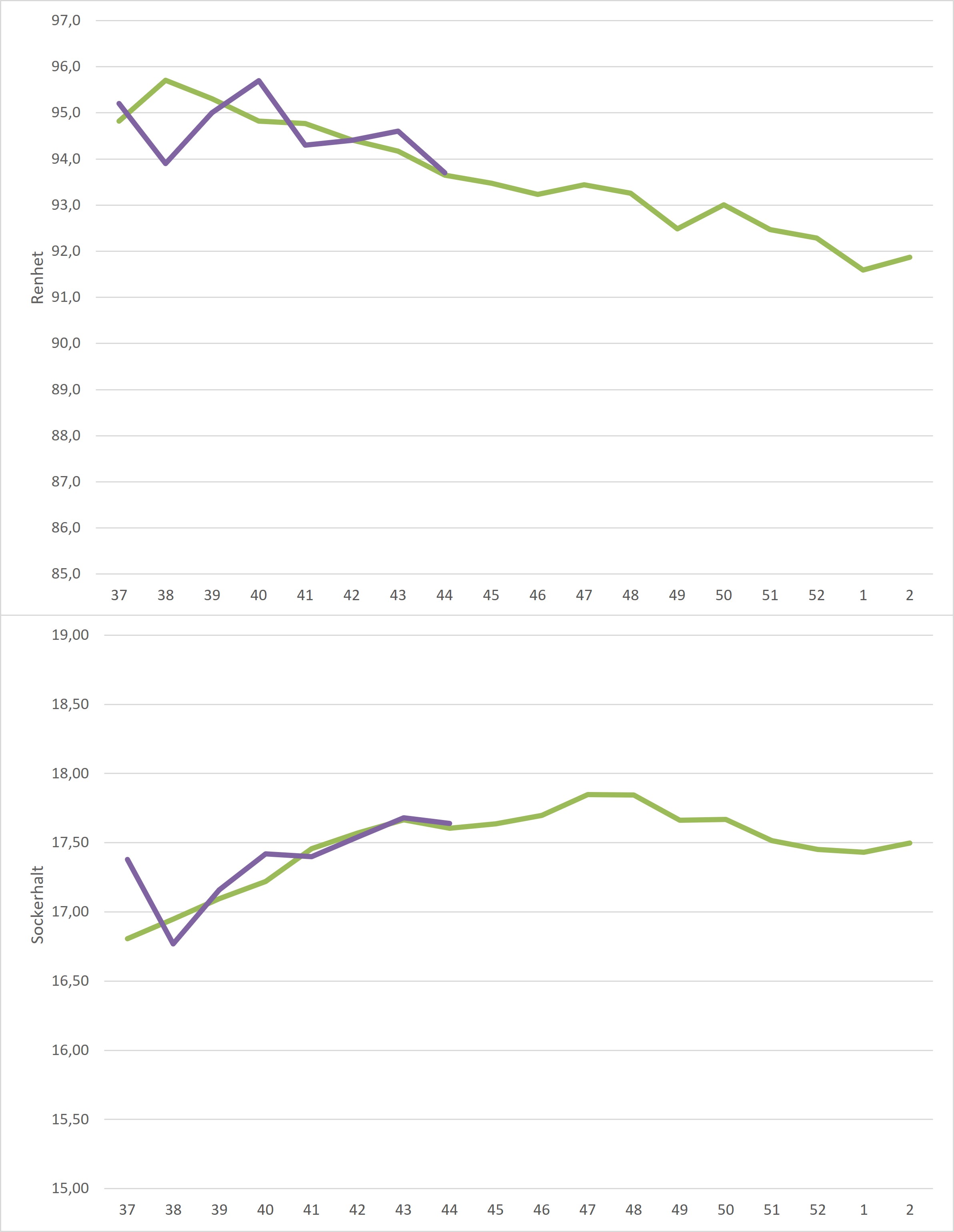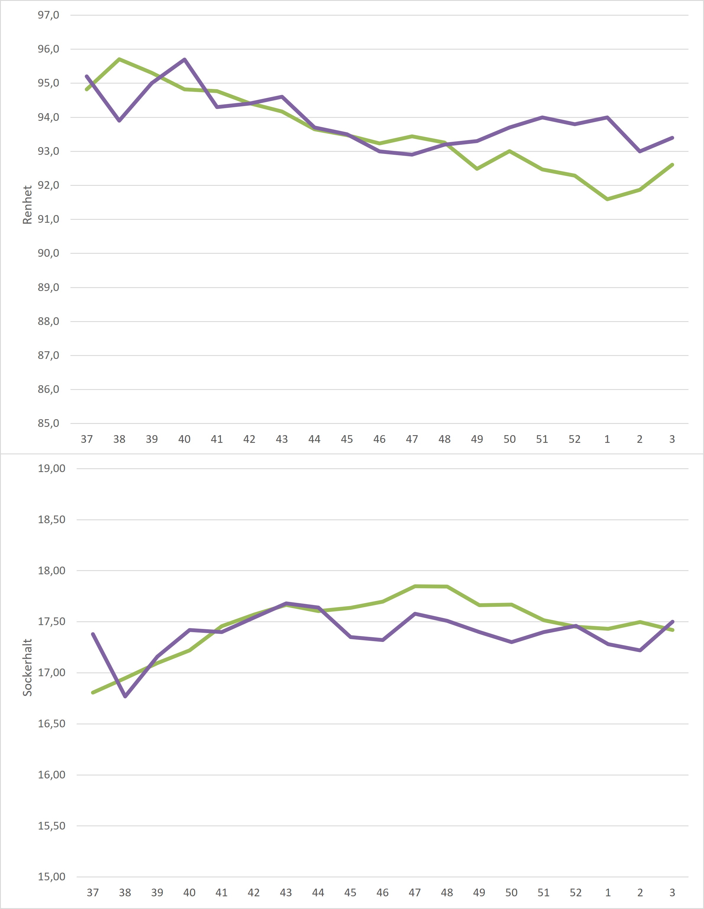 Kampanjedata vecka 3 /irj/portal/nordzucker/sv?NavigationTarget=navurl://91666964a1372051f97eb270d017de34&paraconfig=OT-DS-Server_agriportal&paraurl=http%3A%2F%2Fgut210146.nordzucker.lan%3A8080/cps/rde/xchg/agriportal/hs.xsl/22655.htm2026-01-1900:00:0022655.htmBåde medelrenhet och medelsockerhalt steg sedan föregående vecka. Sockerhalten steg från 17,22% till 17,50% medan renheten steg från 93,0% till 93,4%. Både renhet och sockerhalt landade över femårssnittet för veckan.