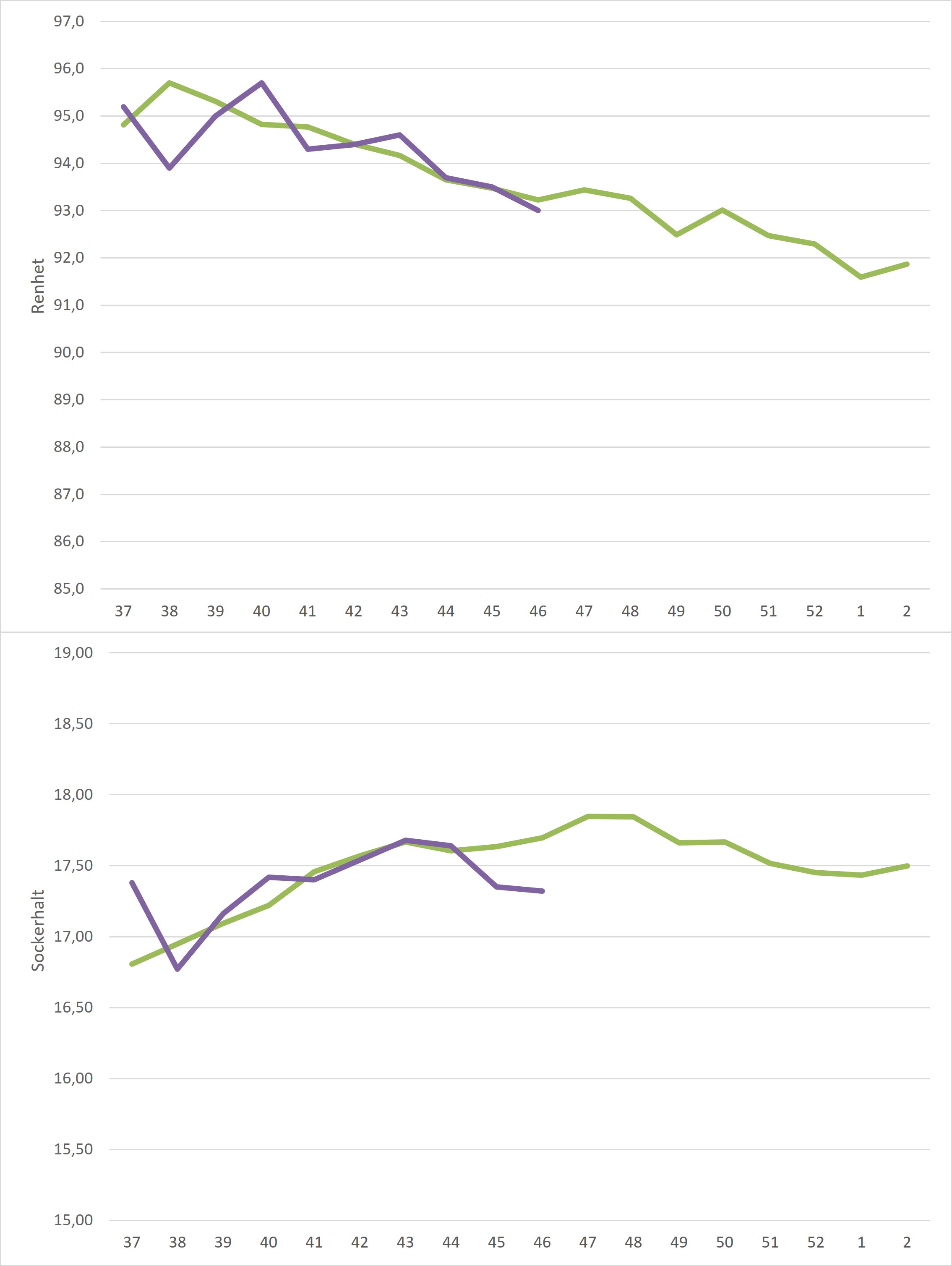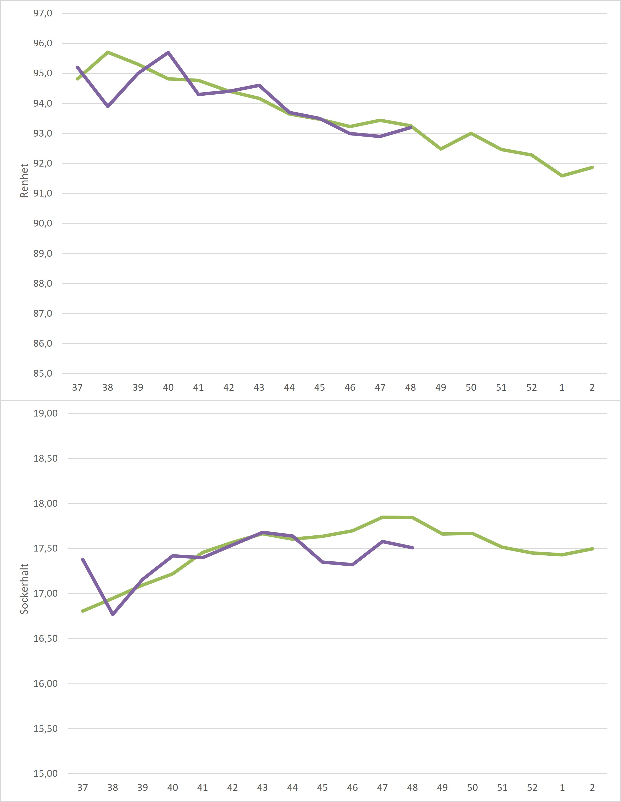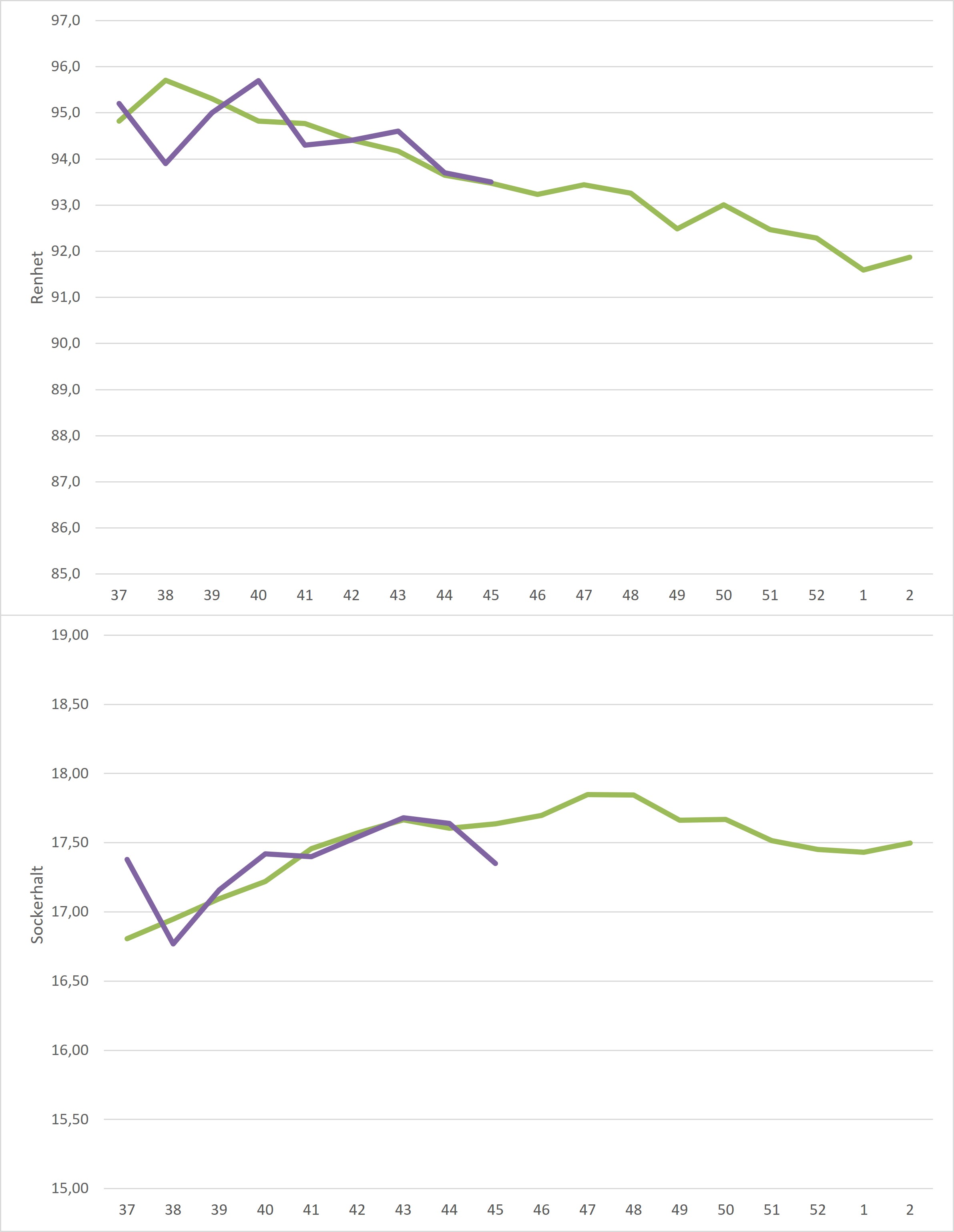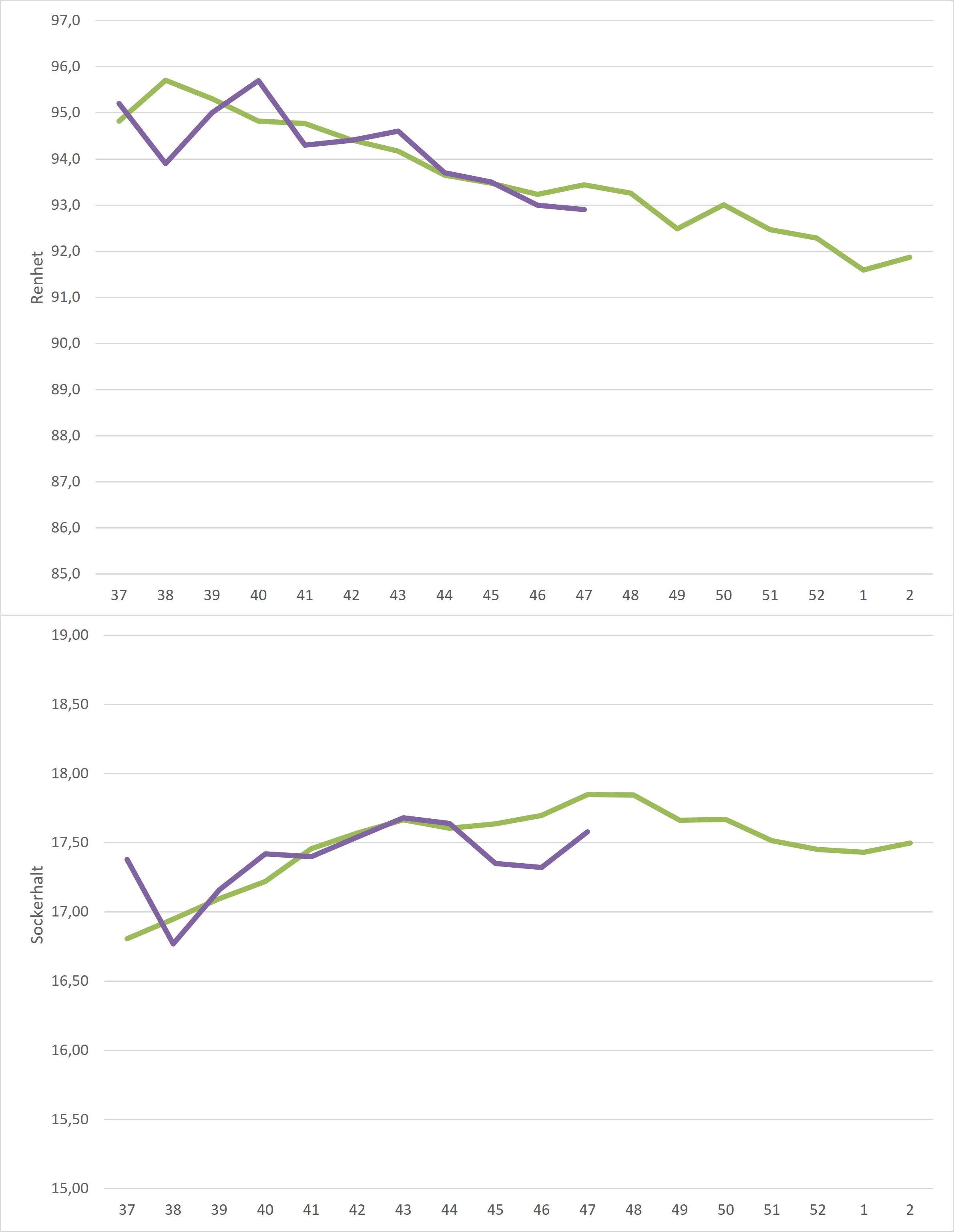 Kampanjedata vecka 3 /irj/portal/nordzucker/sv?NavigationTarget=navurl://91666964a1372051f97eb270d017de34&paraconfig=OT-DS-Server_agriportal&paraurl=http%3A%2F%2Fgut210146.nordzucker.lan%3A8080/cps/rde/xchg/agriportal/hs.xsl/22655.htm2026-01-1900:00:0022655.htmBåde medelrenhet och medelsockerhalt steg sedan föregående vecka. Sockerhalten steg från 17,22% till 17,50% medan renheten steg från 93,0% till 93,4%. Både renhet och sockerhalt landade över femårssnittet för veckan.