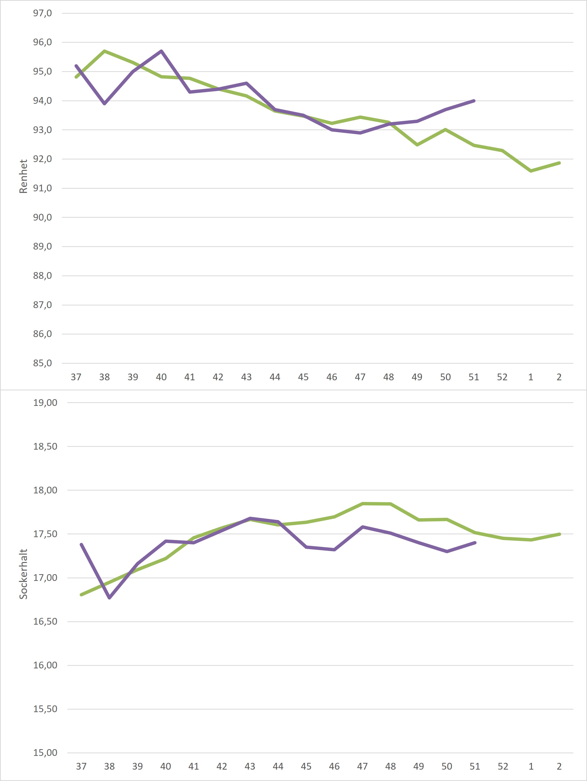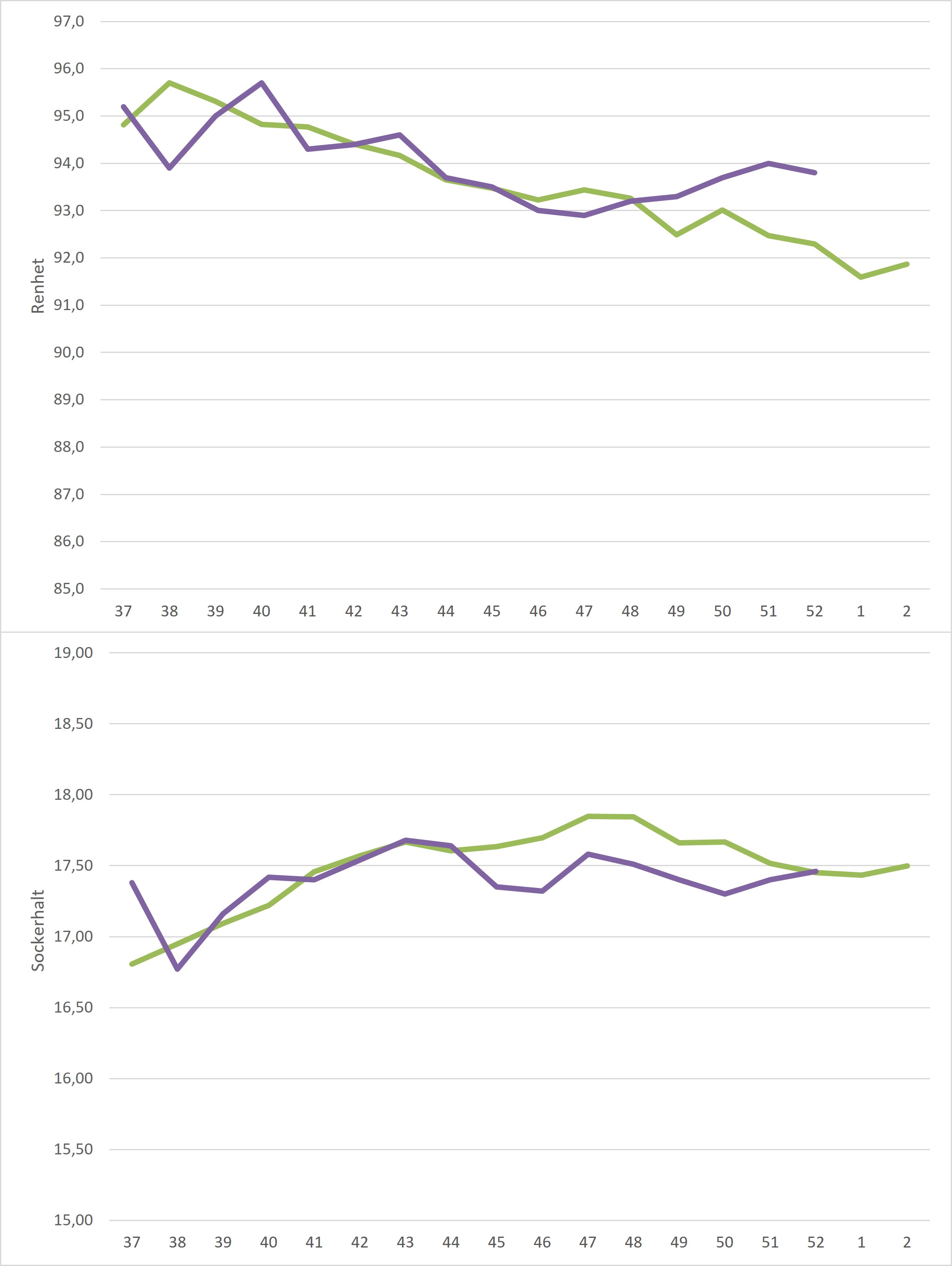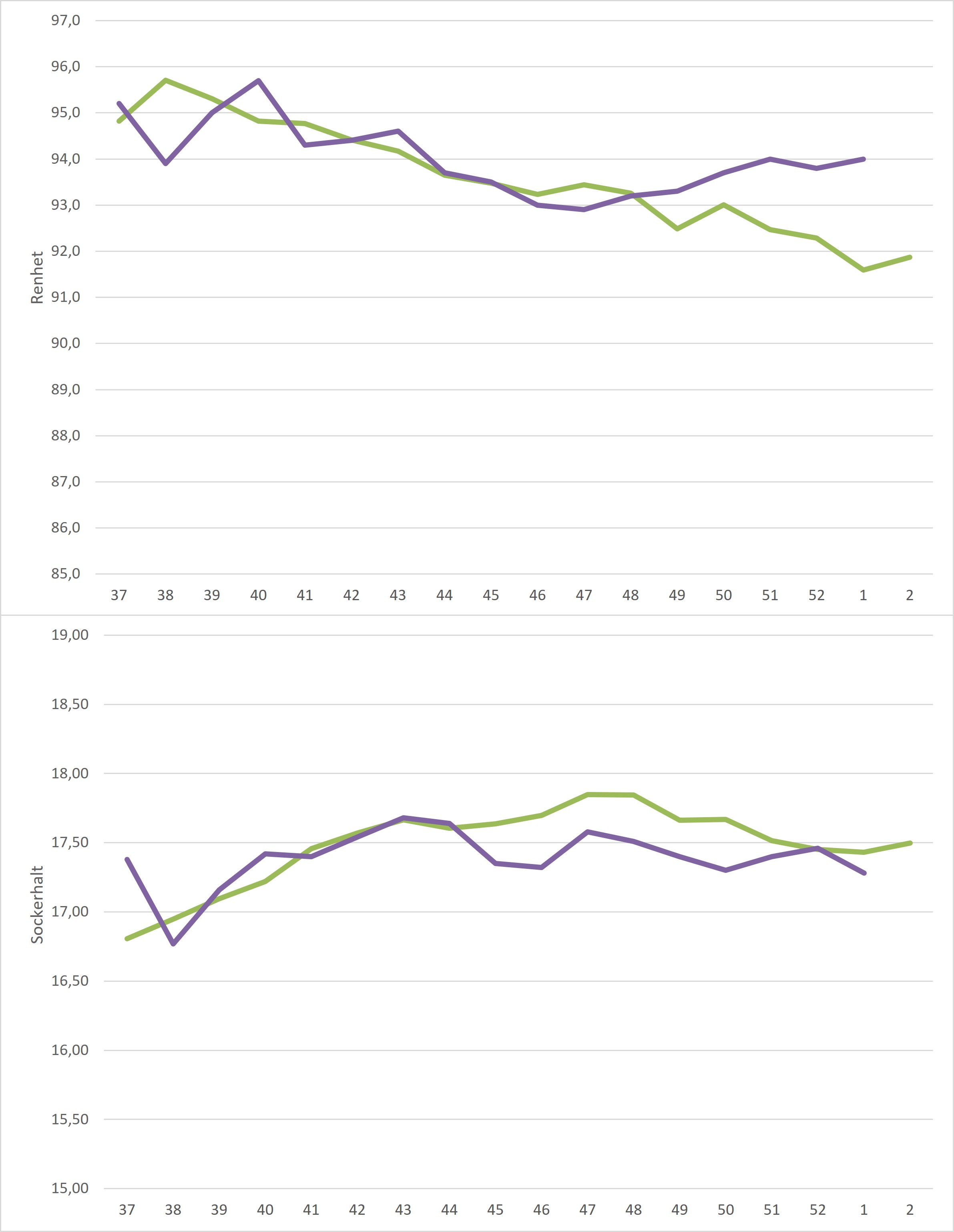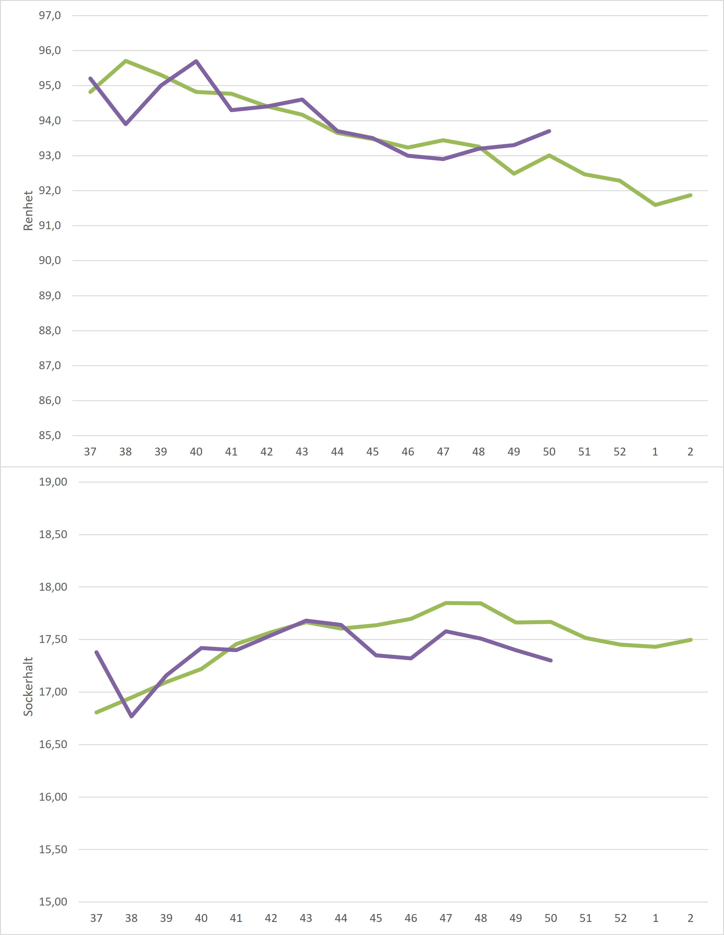 Kampanjedata vecka 52 /irj/portal/nordzucker/sv?NavigationTarget=navurl://91666964a1372051f97eb270d017de34&paraconfig=OT-DS-Server_agriportal&paraurl=http%3A%2F%2Fgut210146.nordzucker.lan%3A8080/cps/rde/xchg/agriportal/hs.xsl/22595.htm2026-01-0100:00:0022595.htmMedelrenheten sjönk från föregående veckas 94,0% till 93,8% men ligger fortsatt över femårsmedel. I motsats till medelrenheten så steg medelsockerhalten från 17,40% till 17,46% och landade därmed på femårsmedel.