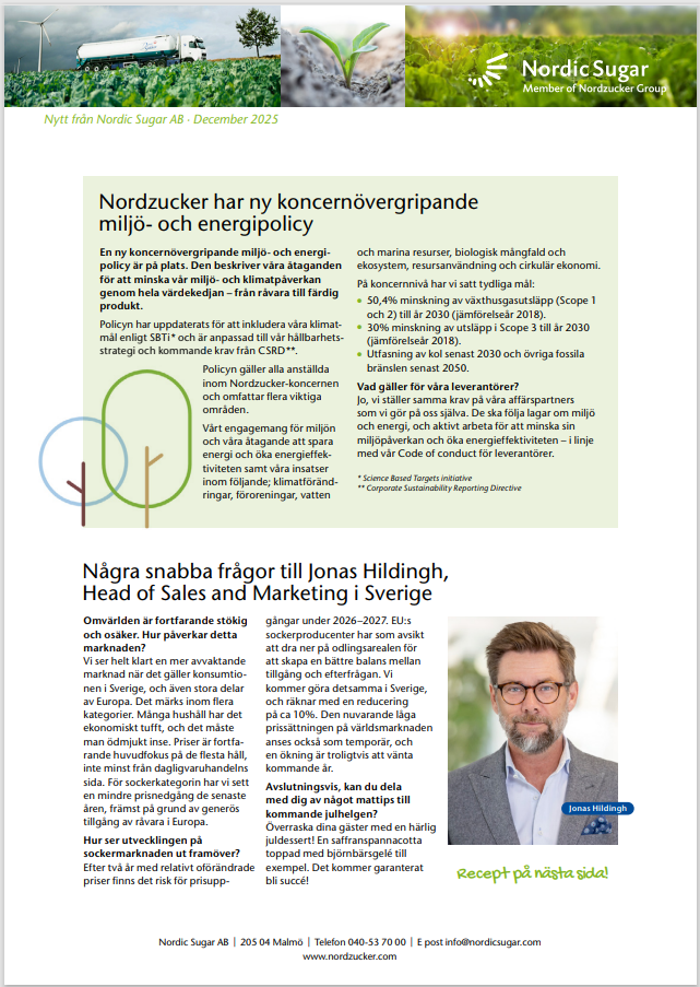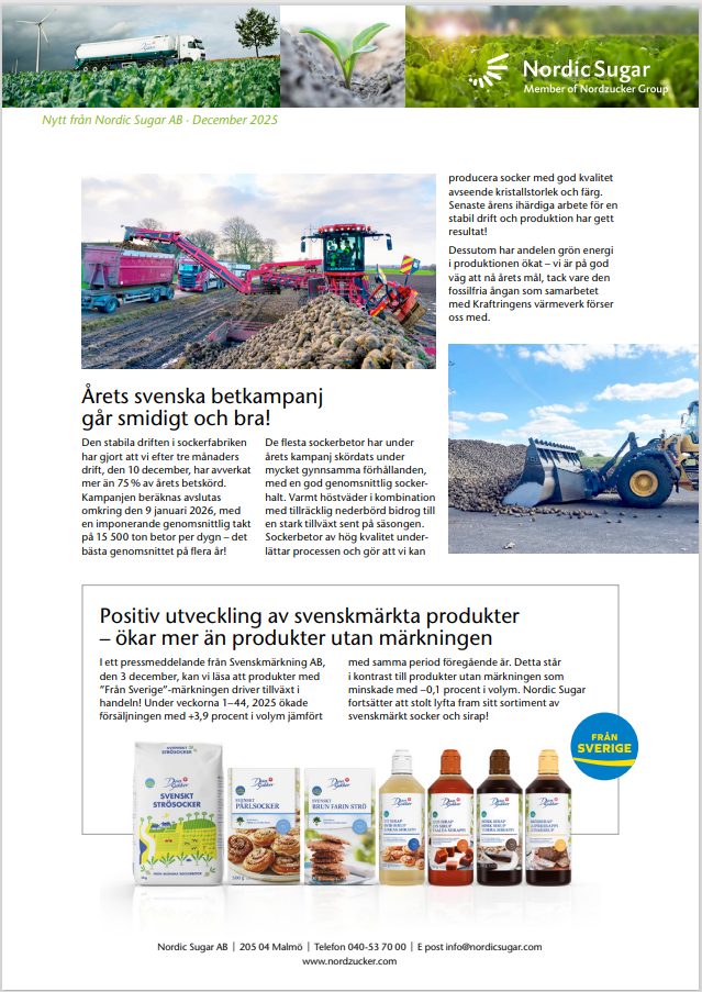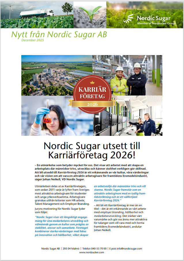 Frivillig reduktion av betareal 2026 – få kompensation och planera för 2027 /irj/portal/nordzucker/sv?NavigationTarget=navurl://91666964a1372051f97eb270d017de34&paraconfig=OT-DS-Server_agriportal&paraurl=http%3A%2F%2Fgut210146.nordzucker.lan%3A8080/cps/rde/xchg/agriportal/hs.xsl/22617.htm2026-01-0700:00:0022617.htmMot bakgrund av att skörden blir högre än förväntat 2025 och exportmöjligheterna för överskottet är dåliga med den prisbild socker har på världsmarknaden, önskar Nordic Sugar reducera produktionen med ca 10 000 ton socker 2026. Vi erbjuder därför odlare att frivilligt dra ner på odlingen 2026 och flytta den arealen till 2027.