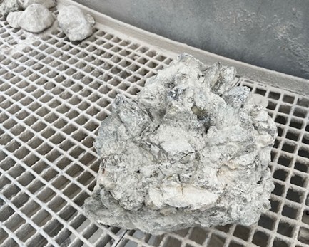 Förra veckan skrev jag om vår stora ångpanna som fick stängas ned. Det visade sig att en del betong krackelerat som gjort att värmen spridit sig till isoleringen. Det innebar att vi fick byta en del plåtar och mura upp innan vi kunde bränna naturgas i den igen. Bilden visar hur det såg ut utvändigt då vi upptäckte skadan.
