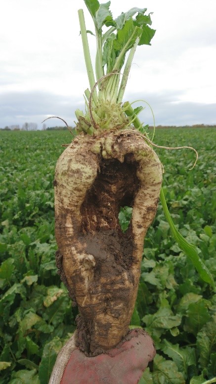 Sena angrepp av Aphanomyces kan ge skorvighet på betorna.