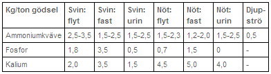 I tabellen anges ungefärligt innehåll av ammoniumkväve och fosfor i stallgödsel. Observera att växtnäringsinnehållet kan variera mycket.