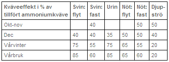 I tabellen nedan anges ungefärlig kväveeffekt i % av ammoniumkvävet vid olika spridningstillfällen, under förutsättning att gödseln myllats inom fyra timmar.