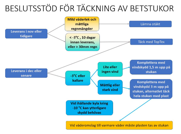 Betor som ska levereras under kampanjens senare del behöver lagras i stuka, allt från några veckor till upp till cirka två månader beroende på kampanjens längd. Man har i försök visat att det är efter totalt 300 sammanlagda daggrader som sockerförlusterna riskerar att skjuta i höjden. Temperaturen i stukan påverkar i hög grad hur stora lagringsförlusterna blir, 30 dygns lagring vid 10 plusgrader kostar lika mycket i sockerförlust som 60 dygn vid 5 plusgrader. Det är viktigt att skapa så goda förhållanden som möjligt i stukan för att minska sockerförlusterna. Betor som ska lagras ska vara hela, rena, friska och torra. Med skonsam upptagning minskar skadorna och så även risken för lagringssvampar. Ett fält som tex har stora Aphanomycesangrepp lämpar sig inte för lagring utan bör levereras så snart som möjligt. För att få ett bra klimat i stukan ska man täcka med Toptex. Duken ska läggas på när temperaturen går under 10 plusgrader. Vid högre temperatur kan stukan med fördel ligga otäckt fram tills det kommer regn. Vid risk för regn, täck stukan, annars kan renheten falla flera procentenheter. Toptex gör att betorna håller sig torra men skyddar inte så bra mot kyla. Sjunker temperaturen till under 3 minusgrader och det blåser så bör stukan även täckas med vindskydd i form av plast. Blir det riktigt kallt kan man behöva komplettera med halm som frostskydd. Det är dock viktigt att man inte lägger halmen direkt på Toptexduken, som då tappar sin vattenavvisande förmåga. Tänk också på att nyupptagna betor är känsligare för frost än de som legat uppe och torkat ett tag. Följ gärna beslutsstödet nedan: